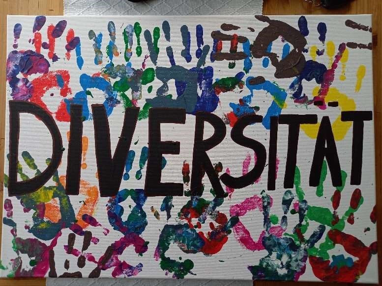 Eine zweite Gruppe hat das Wort Kontraste als gelebte Diversität begriffen. Mia Beckenbauer, Konstanze Diesendorf, Rainer Glaas, Emily Mandel und Lennart Mentzel stellten dies durch bunte Handabdrücke verschiedener Menschen dar. |