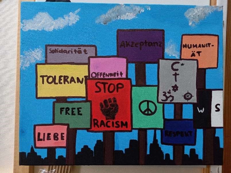 Nelson Bagni und Ariana Najpi malten einen bunten Protestschilderwald, welcher für Werte einer wünschenswerten Gesellschaft protestiert. |