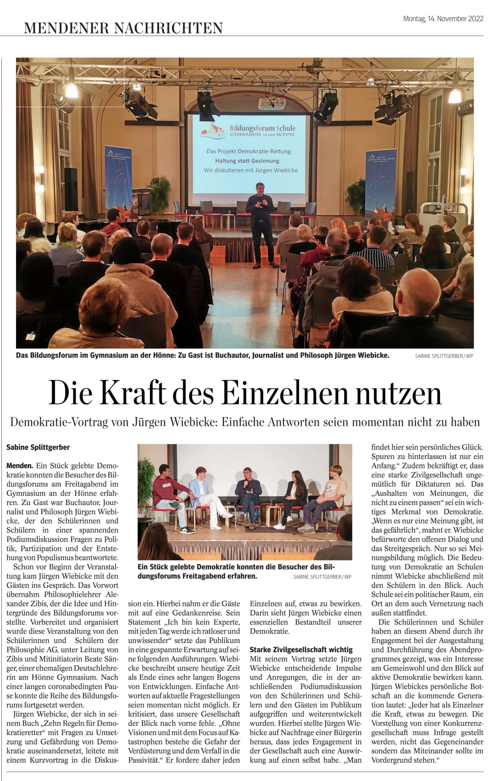 Im Gespräch mit den Schülermoderatoren und dem Publikum ging es vor allem um den Umgang mit Andersdenkenden, wobei es nach Wiebicke darauf ankommt, das Gespräch zu suchen und auch gegensätzliche Meinungen auszuhalten. Weder könne man die Mitmenschen zur Beteiligung an der Demokratie zwingen, noch alle von einer bestimmten Meinung überzeugen. Ohne den Austausch von Gedanken und Gefühlen blieben die Gründe der sogenannten „Demokratiegegner“ im Dunkeln.
